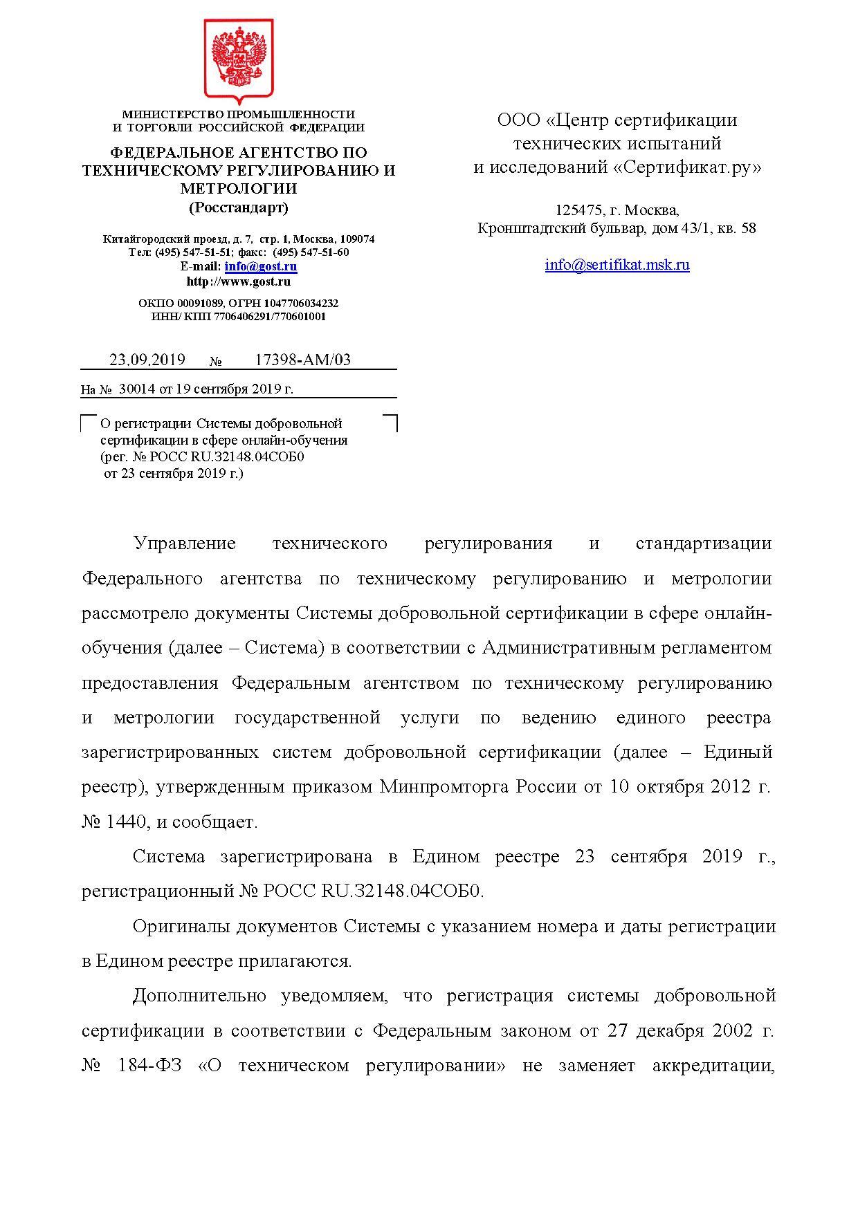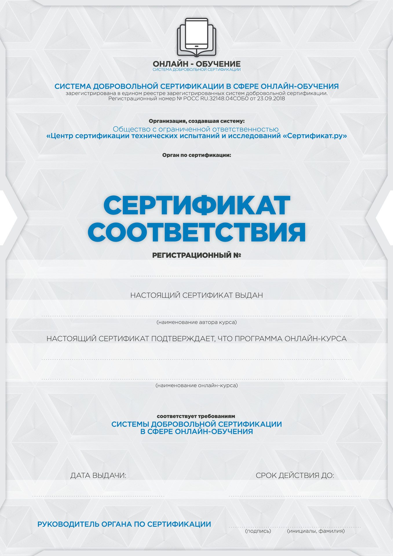 (РОСС RU.З2148.04СОБ0) является единственной системой сертификации онлайн-курсов, утвержденной Федеральным агентством по техническому регулированию и метрологии (РОССТАНДАРТ).